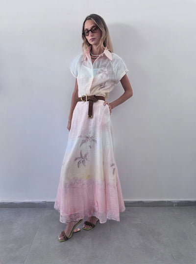 סט קייצי עם הדפס נוף טרופי בגוונים פסטליים רכים. כולל חצאית ארוכה עם גזרה נשפכת וכיסים נסתרים שנסגרת עם רוכסן נסתר , ומכופתרת קלילה עם שרוולים קצרים וכפתורים שגונבים את ההצגה. הסט מגיע יחד עם גופיית ספגטי לבנה מתחת – למראה שכבות מושלם.
